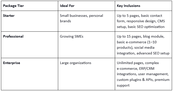 Look for distinct tiers of offerings that complement your objectives when assessing website development packages-